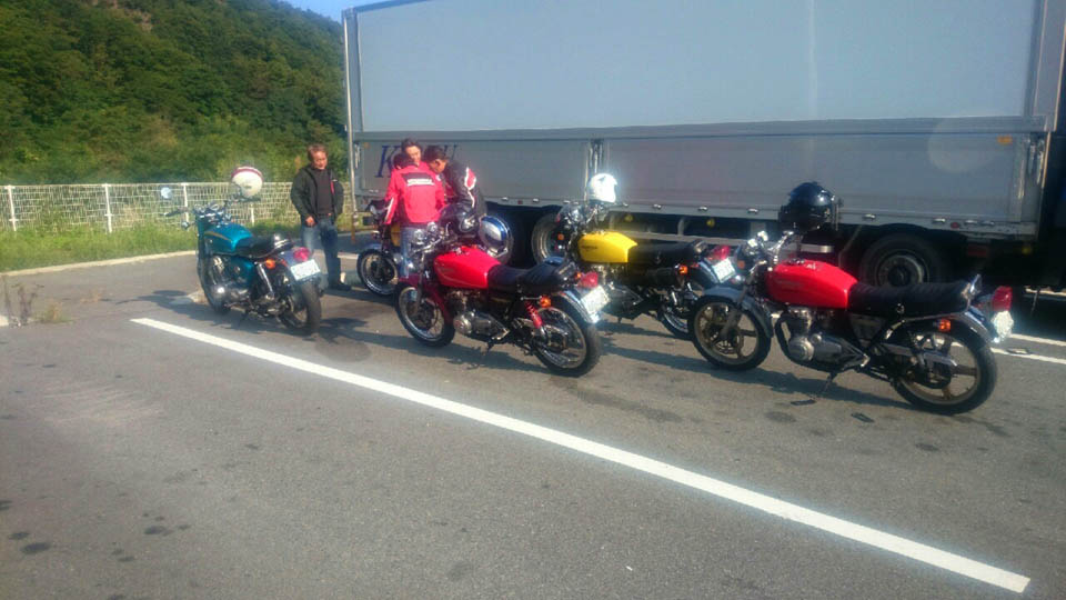 参加者 会長・ジローさん・キムちゃん・DSさん・たぁの5名。 ![]() 集合は中央道藤野PA。 僕は例によってナナハン砂号でおまめ参加。 ところが出発前にエンジンが掛からず往生して、遅刻ですスミマセン。 夜明け前からキックすること数百回、やっと掛かった頃には夜が明けてましたトホホ・・・・ (原因がガス欠だったのはナイショです) ![]() 中央道をシュシュッと走り、須玉ICで下りてコンビニでいっぷく。 ![]() ![]() ![]() ![]() キムちゃん撮影の画像、調子悪いみたいです。 ![]() 須玉の町中でパチリ。 DSさん、男の哀愁漂う背中。 ![]() スタンドで給油したら、レジがカクイイ木製でした! ![]() なんならこんな、便利だか難しいんだか分からんアイテムも♪。 ![]() 再びコンビニ休憩・・・・ ![]() 赤まんまにサクラソウ的な・・・・。 ![]() 稲刈りの進む田んぼを眺めると、秋を感じますのー・・・・ ![]() R299メルヘン街道の 『レストハウスふるさと』に到着。 ![]() きのこ汁食ったり・・・・ ジローさんビーナスライン好きだよね! ![]() 生命維持スーツ着込んだり♪ ![]() ここでDSさんのスロットルワイヤデレスケが発覚、遊びを調整しますが、油切れの様で、動きが渋いです。 それよりビックラコイタのが、エアクリーナーエレメントを着けずに来た事! 高速道路の道中、ピストン溶かさずに済んでよござんした(ワハハー) ![]() さ〜て、応急処置も済んだから、出発しますか♪ ![]() 気持ちの良い高原のワインディングをクネクネと満喫し、麦草峠に到着〜♪ ![]() ![]() キムちゃんのカメラ不調が痛いですのー・・・・ ![]() 峠を越え、青空に向かってレッツゴー! ![]() 白樺湖到着。 ![]() カレーライスやら山菜そばでランチ。 ![]() 白樺湖って、すっかり寂れてショボさ満点っすね・・・・ ![]() ビーナスラインをグルングルン行き〜の・・・・ 白樺湖から霧ヶ峰が向かう途中にあるススキの大群落、今回はチョッチュル時期が早過ぎだったけど、あと十日もしたら、素晴らしいススキの原銀世界が見れるんだろうなぁ・・・・ ![]() 霧ケ峰到着。 ![]() ![]() ここはマツムシソウやらリンドウが自生してるんだよね。 ![]() 暫し休憩したら、更に高度を上げに出発レッツゴー♪ ![]() ![]() 尚も名にし負うワインディング、ビーナスラインをグルングルン上ります。 だけどあれだね、ここいら辺の路面、昔より大分痛んで来たねぇ。 古いバイクで駆け抜けると、おつりが吸収できずにヨレヨレになっちゃいますな。 そうそう、久し振りにみんなで走ったら、キャブ替えてる人達の排気ガスが臭くて参りました(ワハハー) キムちゃん駆るマコちゃん号は調整が合ってるらしく、匂わんかったけど、某お二方のヤツは相当匂いましたので、もう少し調整の余地がありますのー。 ![]() ![]() で、やっとこさ美ヶ原高原美術館前へ到着。 暑過ぎず寒過ぎず、いい塩梅ェの山で、話も弾みます♪ ![]() ![]() 雄大なパノラマをパチリしますが、写真にするとイマイチ冴えねぇ(ワハハー) ![]() DSさんは売店でわさびコロッケ買って・・・・ ![]() これって美味しいの?(ワハハー) ![]() 僕は長蛇の列を並んで鹿の串カツを頼もうと思ったら、僕の一人前の人で売り切れトホホ・・・・ 折角並んだのに・・・・しょうがないので鶏チーズ串カツ。 味はまぁあれだ、普通。 美ヶ原から北側のワインディング県道464は昔から路面が悪くてね、えっちら下りたら麓の温泉でいっぷく。 ![]() ひとっ風呂浴びたら、コーヒー牛乳♪ ![]() みなさん飲ってます。 本当は生ビールでも行きたいところですのー♪ ![]() 東部湯の丸ICから上信越道をぴゅぴゅっと走り、甘楽PAでいっぷく。 高速道路と言えばね、フランクWITHオロナミンCっしょ♪ ![]() さ〜て、大分日も傾いて来ました。 もうひと踏ん張り走りますか♪ ![]() 最後の求刑は嵐山PA。 ちなみに会長はノンストップでバックレました! ![]() ここで解散。 遠足は家へ帰るまでが遠足です。 皆さん道中お気を付けて。 ルート ![]() 本日の走行距離562km チョッチュル走り過ぎたかも?(ワハハー) 幹事のジローさん、お疲れ様でした。 また走りましょう。 |