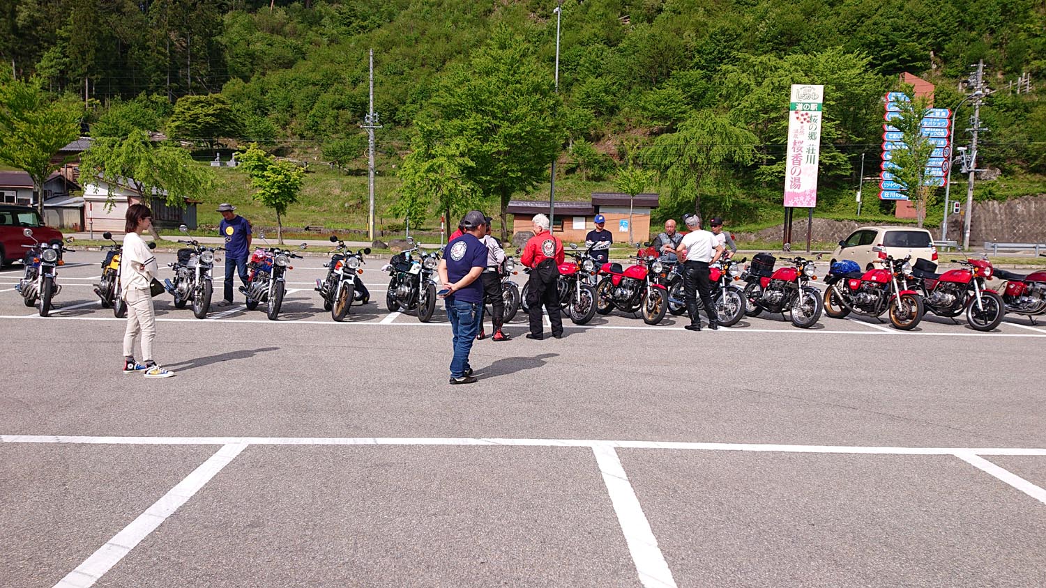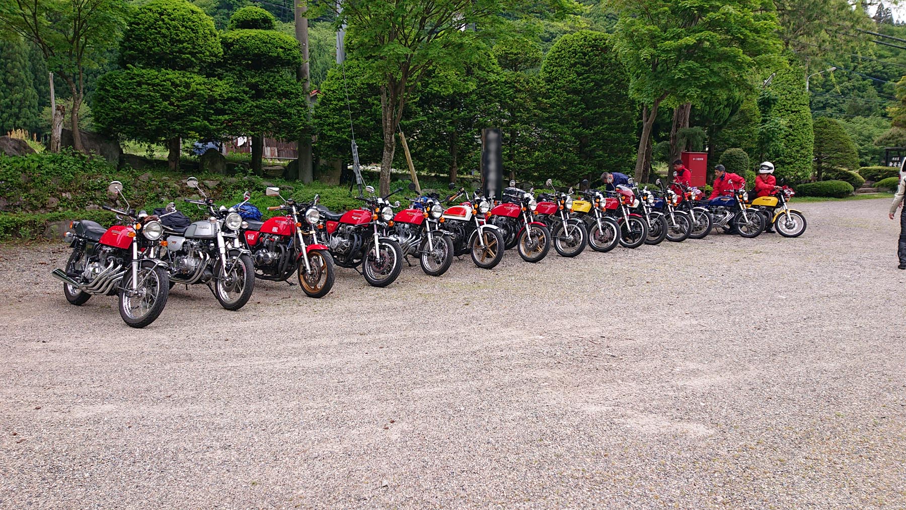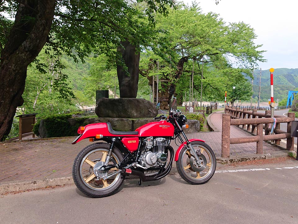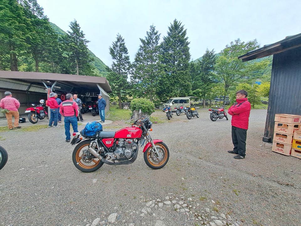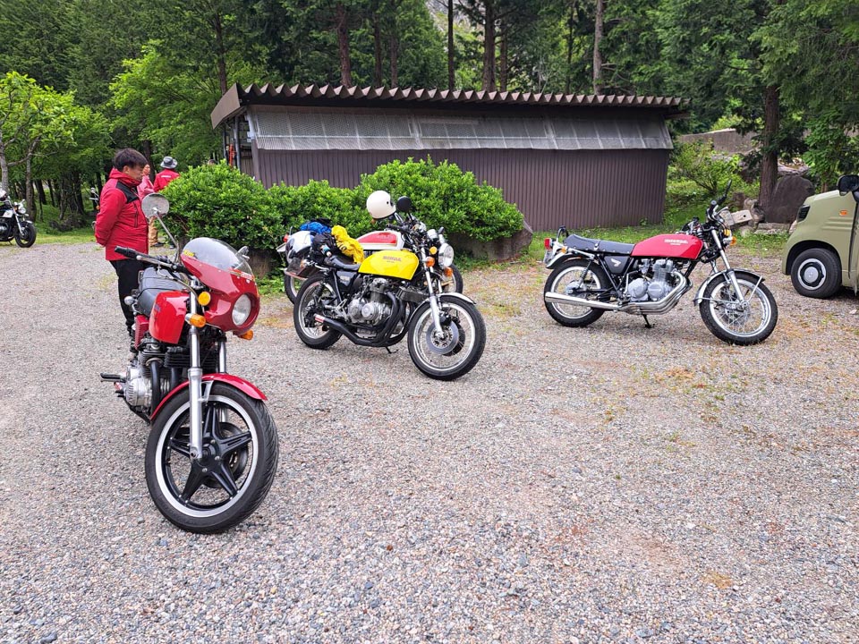 参加者:ジローさん、キムさん、たぁ、ゲストRMご夫妻 群馬・愛知・関西・東京チーム合同のお泊りミーティングに行って来ました。 ![]() 第一集同場所の首都高幻の箱崎Pでキム号をハイエースに積み込み、シュシュッと高速ワープで信州松本着。(所要時間は3.5時間) 最寄りの駐車場にハイエースを停め、マイフォア、キム号の2台を下ろして最寄りのGSで給油したらツーリングスタート♪ ![]() チョイ先にある第二集合場所のセブンイレブンで山梨の殿と合流。 強い日差しの中待っていたら、ガソリン入れ過ぎだった様で溢れて来ました! ガソリンのモッキリはンまかねぇ!(ワハハー) チョッチュル吸い取って調整。 強い日差しでタンクが温められ、内部空気が膨張してガソリンが押し出されちゃうんですね。 給油口のハカマに小穴を設けて空気が抜ける様に工夫せんといけませんな。 ![]() こちらへ向かってる群馬チームが道中アクシデント発生した様で、待つ間にハルジオンをパチリ。 見慣れた白花に混じり、ピンク色の濃いのが咲いてます。 イマイチ色気が描写し切れん(ワハハー) セブンが日影が無く厳しいので、少し先のローソンで待つ事に。 遅れる事30分程で群馬チームが到着し、タッチ&ゴーで出発。 ![]() ![]() 毎度利用さしてもらってる、R158沿い梓湖の手前のみどの手打ちそばでランチ。 蕎麦は少し柔らかかったけど、味が良いだけにチョッチュル残念かな。 ![]() 腹ごしらえが済んでパチリ。 久し振りに再会した群馬チーム会長とよっちゃんにご挨拶、サンゴーフォア乗りの方には初めましてのご挨拶。 ピカピカのサンゴー、良いもん見せてもらいました。 会長号とよっちゃん号はピカピカ完全ノーマル。 やっぱし長く乗ってると、一周廻ってノーマルに戻るんすね♪ ![]() その頃、やはりトランポワープを使い飛騨高山前泊で別ルートで参加の、ゲストMRご夫妻は豪勢なブルジョアランチをお召し上がりのご様子♪ 尚もR158を西へ向かい、懐かしい梓湖の奈川度ダムを横目に見て、安房峠へ・・・・ 僕は寒くて暗くてつまらない安房トンネルをスルーして、旧道の安房峠へ向かいますが、峠道に入ってすぐに冬季通行止めの看板が・・・ 仕方無く引き返して安房トンネル通って皆さんを追います。 ![]() ![]() ![]() トンネル出口、平湯ICにていっぷくパチリ。 昭和の頃ならこの時期、凍える程寒かったんですが、年々温暖化が続き、快適過ぎて拍子抜けするやら空恐ろしいやら。 ![]() 傍らにはイケマやらウドが生えてます♪ 平湯から高山市内までカントリーロードをダラ〜リと流し、高山ICより高山清美道路〜東海北陸自動車道を経て荘川ICで高速を降り、道の駅桜の郷荘川へ。 ![]() 関西チームの待つ道の駅へ到着でパチリ♪ ![]() ![]() ![]() ![]() ![]() ![]() 整列パチリ。 懐かしい面々とご挨拶。 ![]() その頃、遅れて参加のジローさんが出発したと連絡が♪ ![]() 少し先のGSにて給油。 走行は124.5kmの給油が5.91Lで21km/Lをマーク! 大人しく流せば、こんぐらい走るんだねぇ♪ ![]() ![]() 皆さん給油してる間に、僕は荘川桜公園まで先に行き、パチリ♪ それにしてもマイフォア、カクイイわ〜♪(ワハハー) 昔々、荘川に御母衣ダムを建設した折、湖底に沈んだ集落にあった桜の老木をここへ移植したんだそうです。 当時既に樹齢500年だったらしいけど、凄いねぇ。 参考資料 ![]() ![]() ![]() ![]() ![]() 本日のお宿に到着でパチリ♪ 相変わらず良い風情であります。 綺麗に磨かれた床板とかね、ゆらゆらガラスが琴線に触れるのです。(流しのカランが刷新されちゃったのはチョッチュル残念かな) ![]() ![]() 外湯への送迎バスを待つ間に河原やお庭を散策。 ゴン太ワラビやらウドが生えてます。 オダマキも綺麗。 ここへ至る道々、ワラビを摘んでる人がチラホラ見えましたねぇ。 眼下の渓流にはカジカガエルが鳴き、渓魚のライズが頻繁に見られ、釣り人心をくすぐりますのー♪ 次回は事前にタックルを郵送しといて、チョイの間イブニングライズを狙うなんて、悪く無いなぁ。 ![]() で、お風呂が済んだらお待ちかね、宴スタート♪ ![]() しっかり仕事がされた料理は予算に鑑みると、破格。 ![]() 今回ご参加の皆さん限定で、ヨンフォア発売50周年祈念ワッペンが配られました。 考えてみれば、古い方とはもう20年以上のお付き合いなんですな。 ![]() てなことをやってると、ジローさんご到着♪ 前回同様、寒かったそうです(ワハハー) ![]() 流しの大ちゃんスタンバイオッケーで、カラオケカーニヴァォスタート! トップバッターは関西会長。 ![]() シミ♪ ![]() ![]() お口直しに二の膳を♪ ![]() ![]() ![]() ![]() ![]() ![]() ![]() ![]() ナリキリブラックモア・ナリキリジュリー・ナリキリジョニー・ナリキリ清志郎豪華共演♪ ![]() 二次会は例年通り日付変更線を越えた(らしいよ) そして就寝後は皆さんソレックスをゴァゴァ言わせた(らしいよ) ![]() 朝餉であります。 ![]() 朝からガッツリいけちゃうねぇ♪ ![]() 名物に美味いものあり朴葉味噌。 ![]() コイツを食う