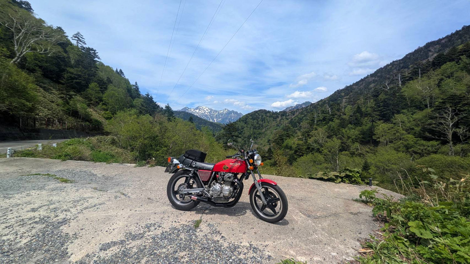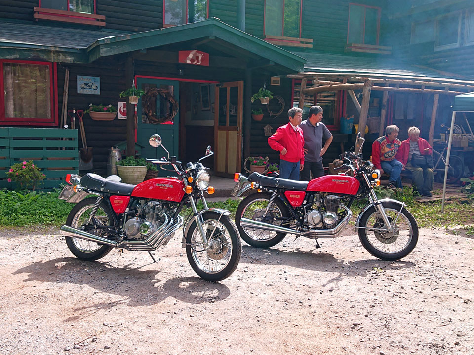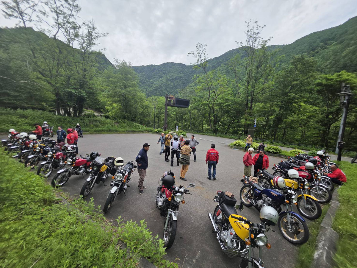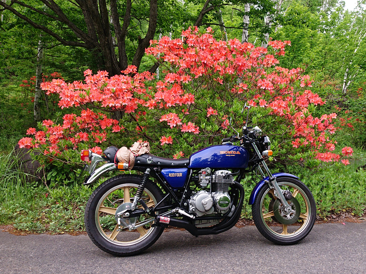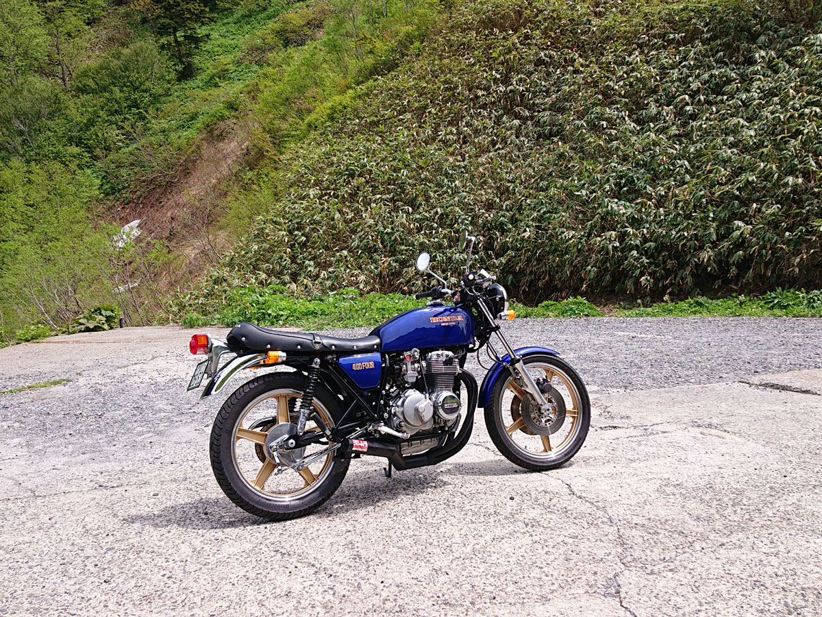 6月7日〜8日の二日間で、毎年恒例の合同ツーリングに行って来ました。 主催は4into1owners club関西・4into1owners club FOURS・CB400FOUR OWNERS CLUB ゲストで山梨の殿・西新井秘宝館館主・I氏・ベホリ氏、総勢22名。 昨年同様、同伴者のキムさんとは首都高にある、幻の箱崎PAで6時に集合。 ![]() 去年はそのまんま積めた筈なのに、今年は何故かナンバープレートが当たり、外しました。 首都高〜中央道をワープし、長野県へ向かうんですが、首都高から相模湖の先までバッチリ渋滞に遭い、 岡谷ICまでは4時間20分掛かってしまいました。 ![]() 岡谷市内の某パーキングに到着、ここからツーリング開始です。 ![]() と思ったら、キャブレターから派手にオーバーフロー、第一デレスケ確定です♪(ワハハー) まぁあれだ、3ヵ月放置してたから、フロートの動きが悪くなってんですね。 暫くコックをON/OFF繰り返せば治るでしょう。 ![]() 塩尻の郊外で最初の給油。 ここまでの走行距離は13km。 群馬チームとの集合場所のローソンは予定を1時間30分過ぎてるのでスルー・・・・ ![]() ![]() R158をグルングルン行き、梓湖の手前のいつものお蕎麦屋さんでランチ。 群馬チームの皆さん、遅れてしまいすみませんでした。 ![]() お蕎麦は去年ほどではないが、やっぱし柔らかめ。 来年はバリカタで頼むとしましょう♪ そうそう、窓の外ではエゾハルゼミの蝉時雨。 キュリリ・・・・ケケケケケ・・・・と涼し気に合唱していたね。 この二日間、山の方ならどこにいても鳴いていたね。 尚もR158を西進し、安房トンネル手前から、旧道の安房峠へ・・・・ ![]() ![]() ![]() 峠の茶屋跡にて、パチリ。 ![]() 寂れてはいるけれど、630円も払ってつまらんトンネル走るよりも、僕は断然こっちを選びますね! VIVA! 旧道!! ![]() ![]() イタドリやら育ち過ぎのタラの芽が生えてますが、お目当てのウドはナッシングで残念。 ここから岐阜県側の下りは路面状態も良く、思う存分クネクネを満喫出来ました。 30年前にこの時期にここいら辺でウドやワラビをたくさん採ったんですが、 温暖化が進んだ今は山菜は伸びちゃって手遅れでありました。 ![]() それでもしばらく降りたところで良さげなエリアがあり、散策。 ここでイケマ・トリアシショウマなんかをゲッチュ♪ ![]() これは育ち過ぎたモミジガサ(別名シドケ) 次に来るんならGW直後ですが、生憎その頃は積雪通行止めなんすよねー。 尊敬するマッチャンの鉄人様より、これは木いちごの類ではとのご指摘を頂きました。 確かに僕も現場で一瞬思い浮かんだのですが、これにクリソツな木いちごと言えばカジイチゴ。 カジイチゴは地元に沢山生えており、見慣れいる種。 カジイチゴは寒冷地には生えないので、標高から言っても無いかなと。 さりとて葉っぱや茎は典型的なモミジガサとは少し様子が違うのは認める所。 葉っぱを齧ってみれば判ったんだろうけど、そこまでする程の事でも無いかなと。 てなわけで、モミジガサに良く似たヤツって事に致しましょう♪ ![]() 更にクネクネ降りていくと、エテ公が居たので写真を撮ろうと近づくと、逃げられちゃった。 傍らを見れば、ウド♪ 穂先の柔らかいところを摘んで、今夜の二次会のおかずにしましょう。 安房峠越えを満喫したら、トンネル出口料金所のところで先行していたキムさんと落ち合い、いっぷく。 彼は高山方面から平湯トンネルを通りやって来る予定の関西・群馬組をここで待つとの事。 僕は時間的余裕はあると踏んで、本日の第2スペシャルステージ、平湯峠へ向かう事に。 ![]() ![]() 念願だった平湯峠をグルングルン上り、天辺でパチリ。 安房峠よりも観光バスが通る分、良い路面が維持されてんですね。 VIVA! 旧道!! ここからR158までクネクネ下り、R158出会いにて、やってくるであろう関西・群馬チームを待ちますが、 中々やって来ません。 ここでモヨーシテ来てしまい、雉撃ちを一発ぶっ放します。 正調クラッシックスタイルで蕗の葉っぱで拭って一丁上がり♪ 改めて道路端へ出ると、黄色の斥候フォアが一台通りかかり、手を振ってます。 暫く後続を待ちますが、待てど暮らせど来ネェので、痺れを切らし、もう一度平湯峠をグルングルン越え、 キムさんの待つ安房トンネル料金所まで戻ると、ちょうど関西・群馬チームも平湯トンネルルートで到着したところでありました。 ![]() 全員揃って、白骨温泉方面へ抜ける県道300出会いの広場でいっぷく。 ここからのクネクネワインディングも中々のモンでありました。 ![]() 途中、満開のヤマツツジの前でパチリしたり、途中でウドやらイケマ摘んだり道草しながらクネクネ上がり・・・・ ![]() ![]() ![]() ![]() ![]() なんちゃらカフェでいっぷく。 ここはどうやら幹事Mちゃんのご希望スポットみたいですのー。 ここから本日の宿まで走るんですが、途中でウドなんか採りながら走っていたら、 腰に巻いていたジャンバーがほどけて飛んで行きそうに。 走りながらジャンバーを小脇に抱え直して路肩に緊急停止
